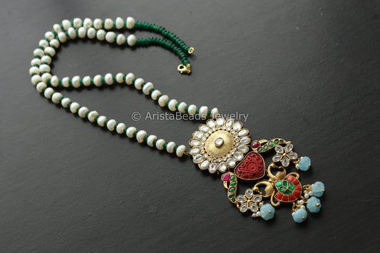 Fusion Real Pearls Jadau Necklace -Carved Stone