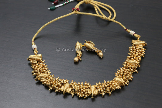 Gajra Style Ganesha Temple Necklace Set - Gold