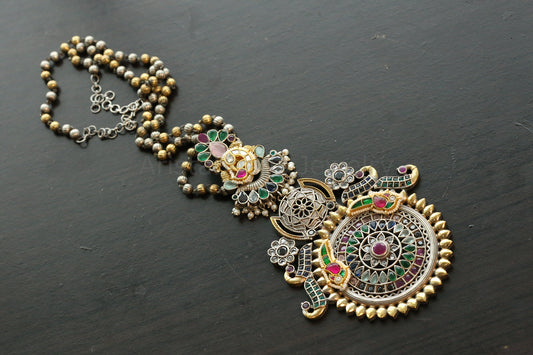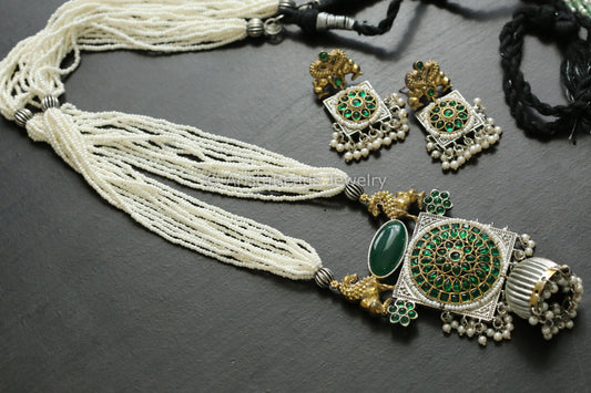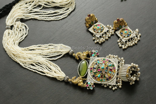 Handmade Dual Tone Jhumka Necklace Set - Navratan