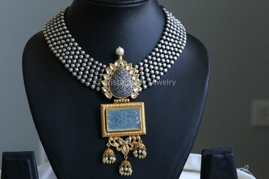 Handmade Dual Tone Kundan & Carved Stone Necklace - Mint