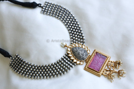 Handmade Dual Tone Kundan & Carved Stone Necklace - Pink