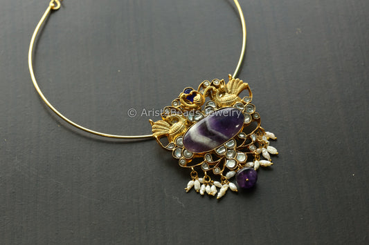 Handmade Fusion Jadau Pendant -Amethyst (Hasli Removable)