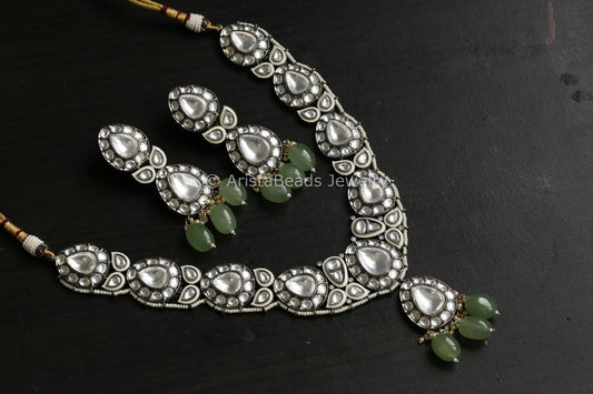 Jadau & Pearls Silver Look Alike Necklace Set - Blue Green