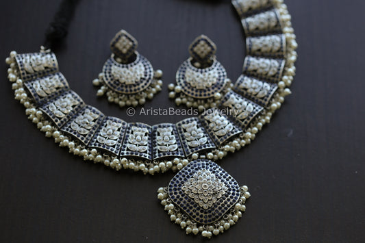 Jadau CZ Oxidized Necklace Set - Clear Blue