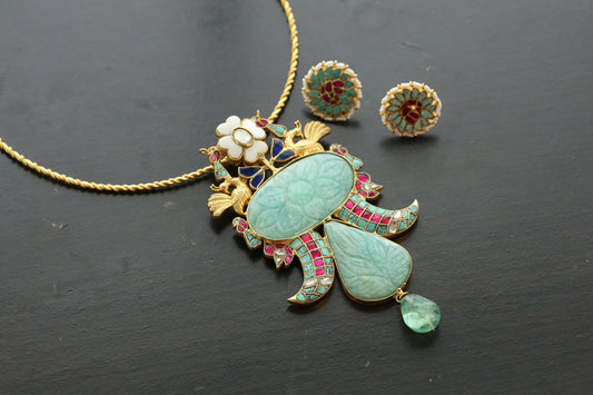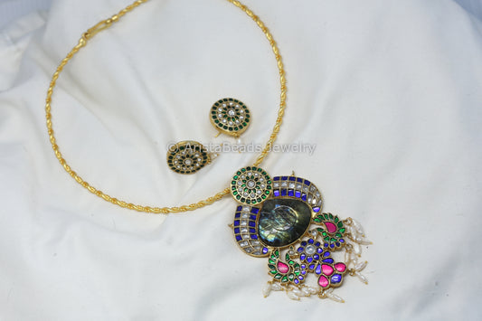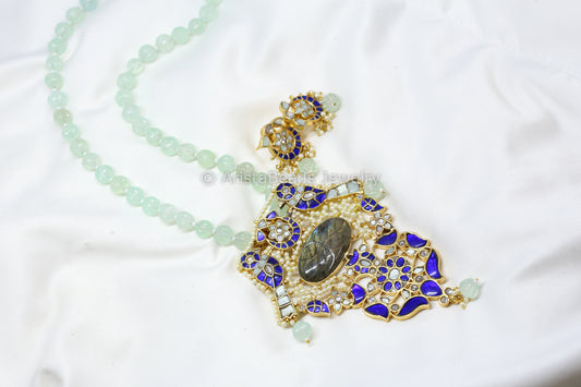 Jadau Fusion Green Blue Pendant Set - Labradorite & Chalcedony (Removable)