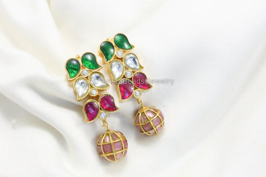 Jadau Kundan Earrings - Strawberry Quartz Drops