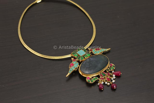 Jadau Kundan Pendant Necklace - Labradorite Cab