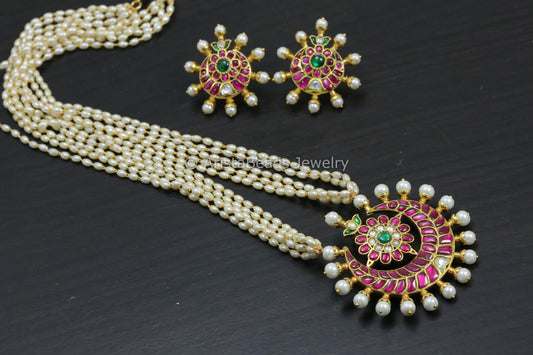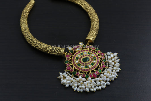 Jadau Kundan Pendant In Carved Hasli & Real Pearls