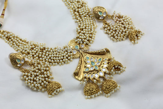 Kundan & Pearl Guttapusalu Necklace Set - Mint