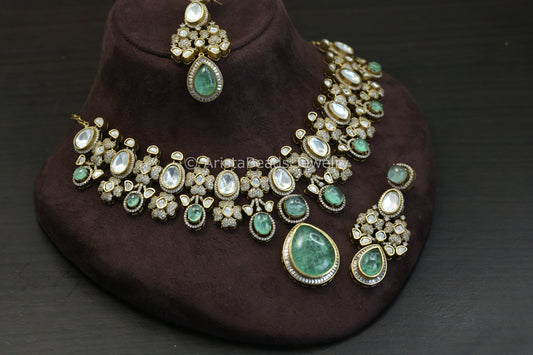 Kundam Polki Enamel Claw Necklace Set - Blue