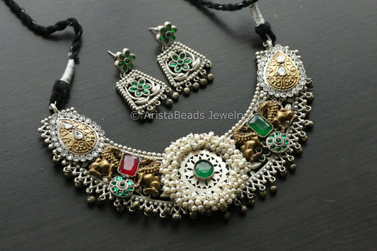 Kundan Gajra Style Guttapusalu Necklace Set - Green