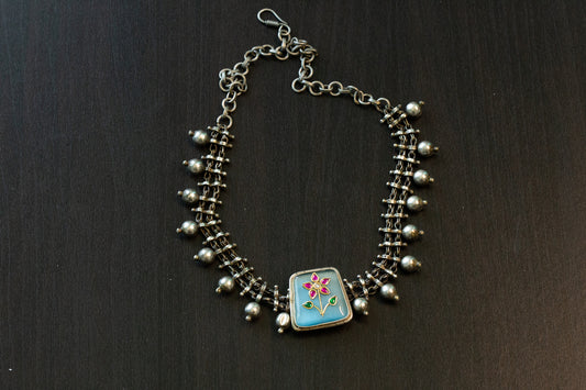 Kundan Inlay Silver Look Alike Fusion Necklace - Blue