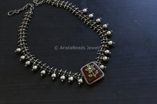 Kundan Inlay Silver Look Alike Fusion Necklace - Red