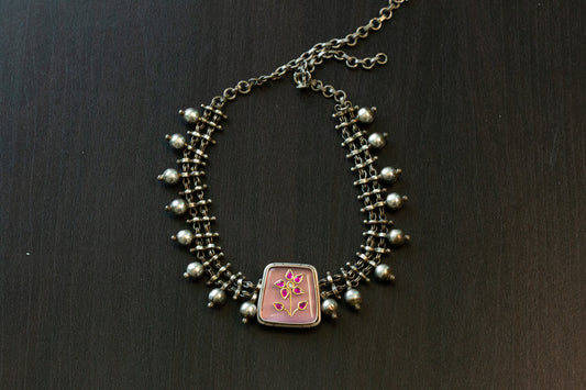 Kundan Inlay Silver Look Alike Fusion Necklace - Pink (T102-34)