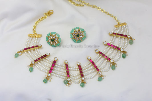Kundan Jadau Pearl Necklace Set - Ruby Green