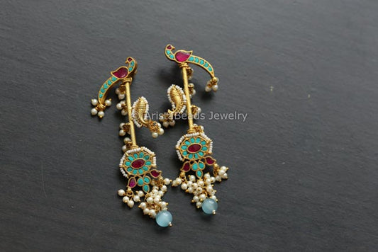 Long Fine Jadau Kundan Work Earrings - TurquoiseRegular price $ 53.00 USDRegular priceUnit price per