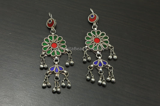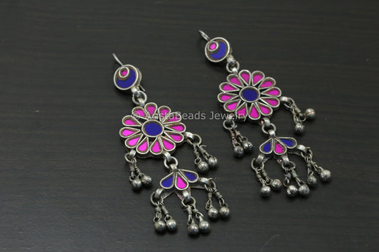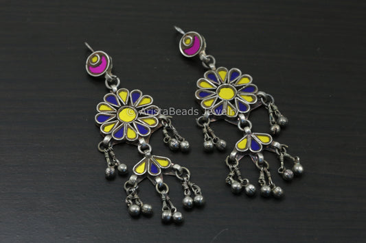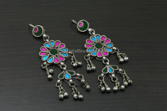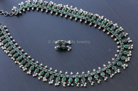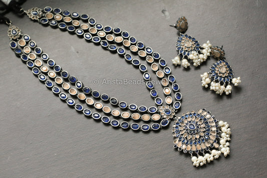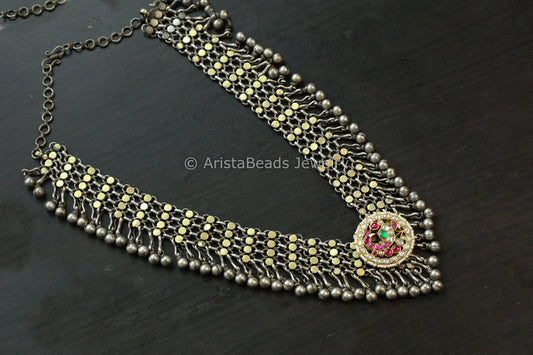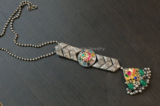 Long Oxidized Pendant Necklace With Kundan Motifs