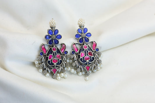 Silver Look Alike Kundan Earrings With Rice Pearls - Ruby