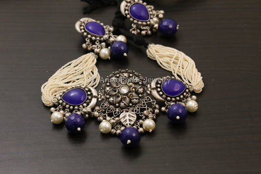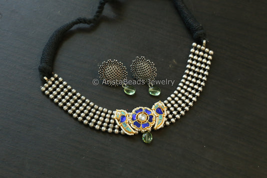 Silver Look Alike Kundan Peacock Necklace - Blue