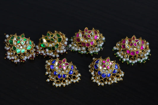Silver Look Alike Kundan Earrings With Rice Pearls - Green Ruby