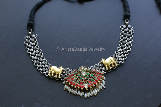 Silver Look Alike Necklace Jadau Kundan Motif Choker
