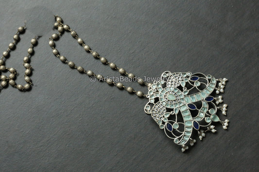 Silver Look Alike Necklace With Jadau Peacock Motif