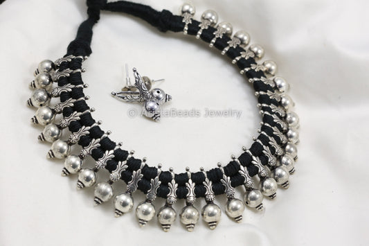Silver Look Alike Thread Necklace - Black