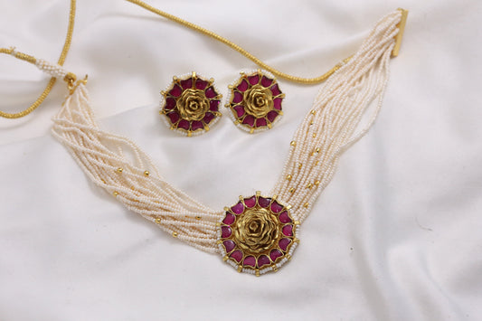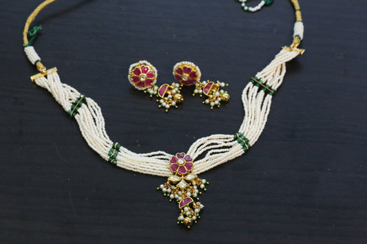 Dainty Pachi Kundan Necklace Set- Ruby Beads