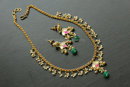 Dainty Pachi Kundan Necklace Set - Ruby Green