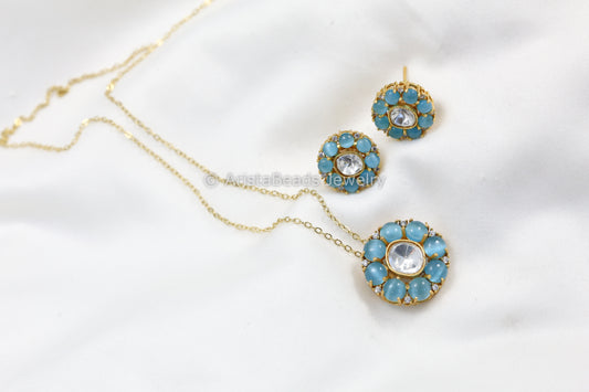 Dainty Uncut Polki Pendant Set - Blue