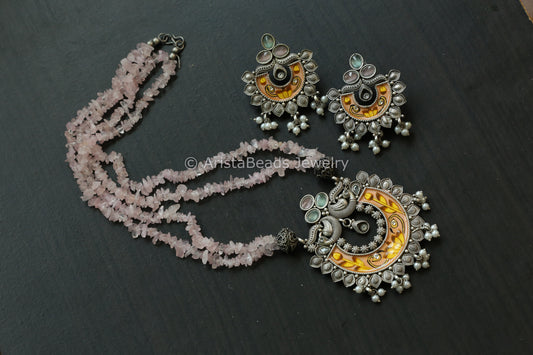 Enamel Oxidized Necklace Set - Rose Quartz Beads