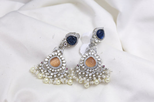 Extra Large Uncut Polki Earrings - Blue Carved Stone