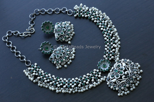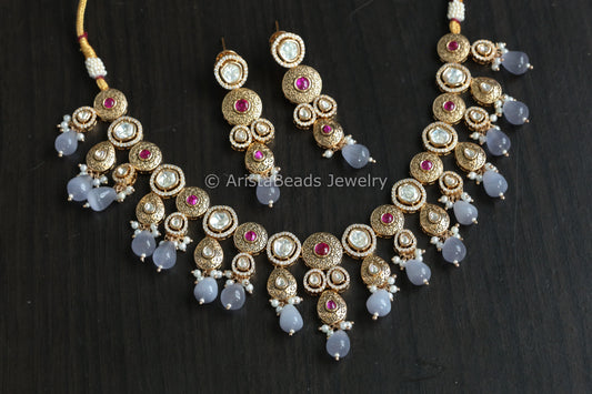 Filigree Polki Kundan, Enamel & Mirco CZ Necklace Set - Gray Monalisa Drops