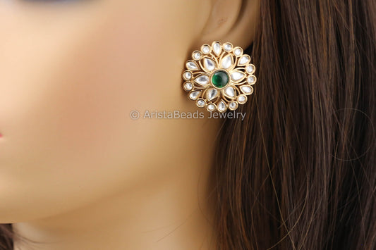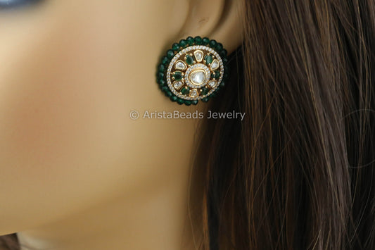 Next To Real Large Moissanite Polki & Jadau Stone Studs - Green
