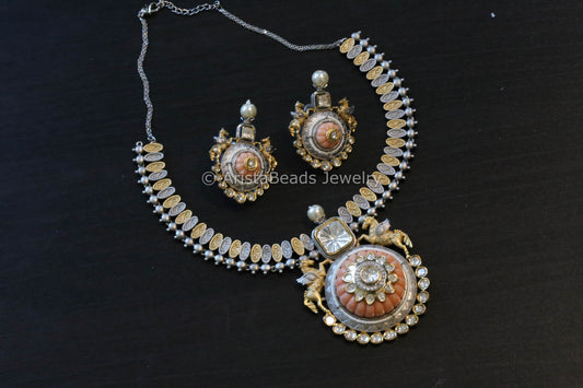 Premium Quality Dual Tone Polki & Carved Stone Set- Coral (103-53)