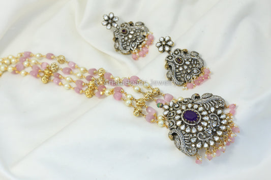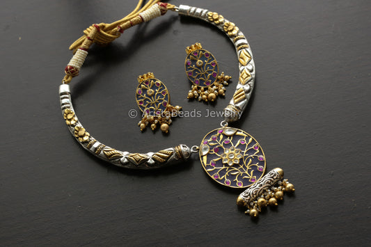 Silver Look Alike Inlay Kundan Hasli Set - Purple