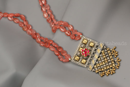 925 Silver Kundan Necklace In Strawberry Quartz Beads