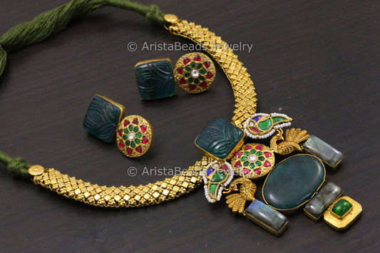 925 Silver Kundan Necklace Set With Real Labrodorite & Onyx