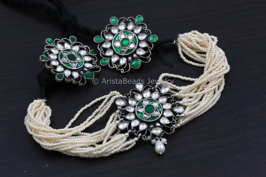 925 Silver Kundan Choker Set - Emerald