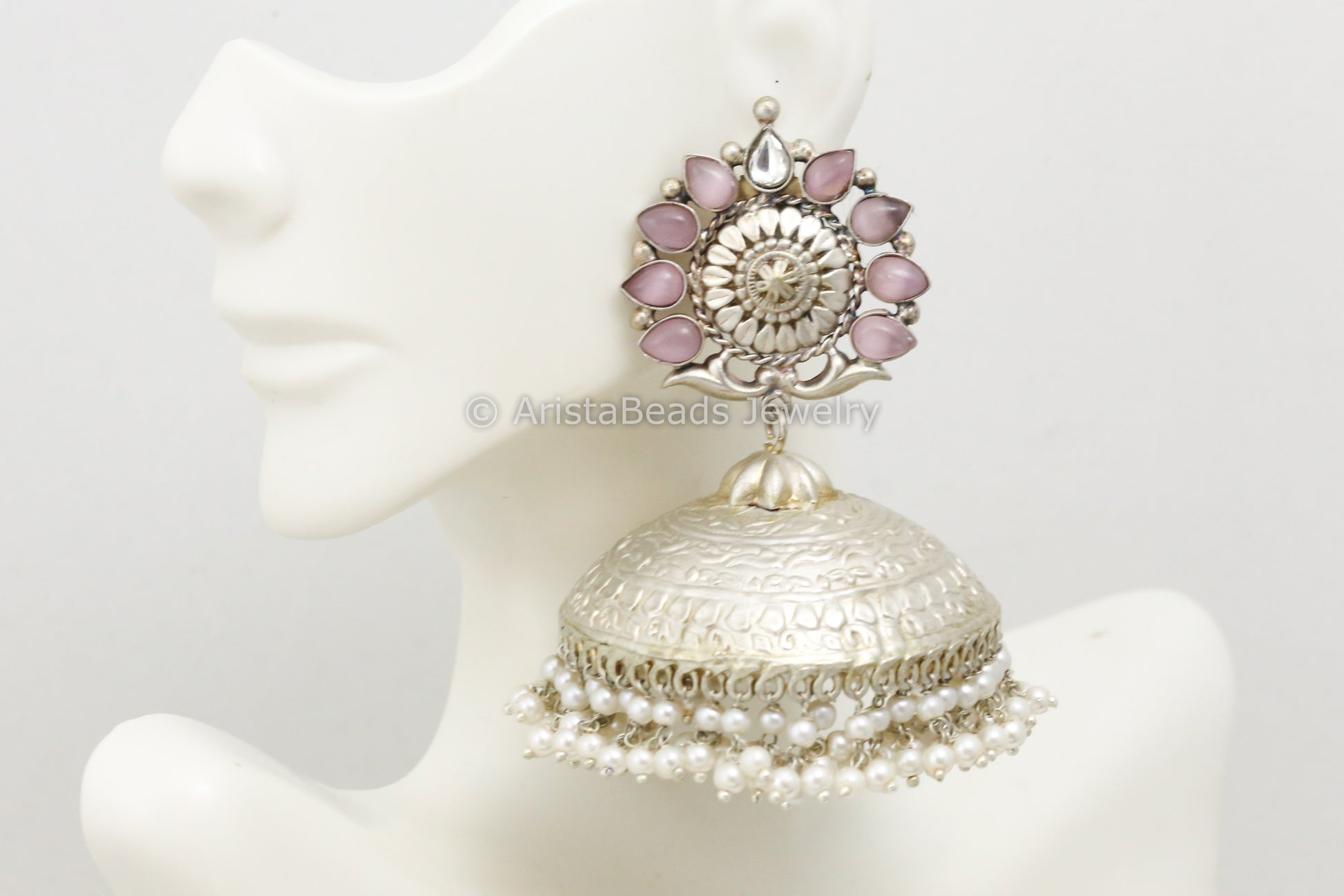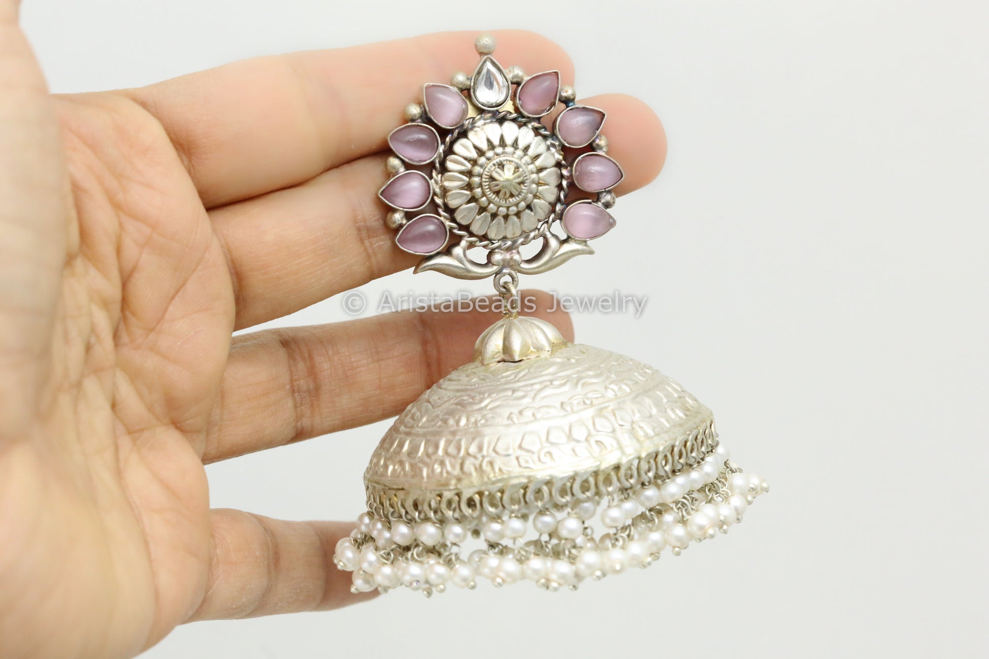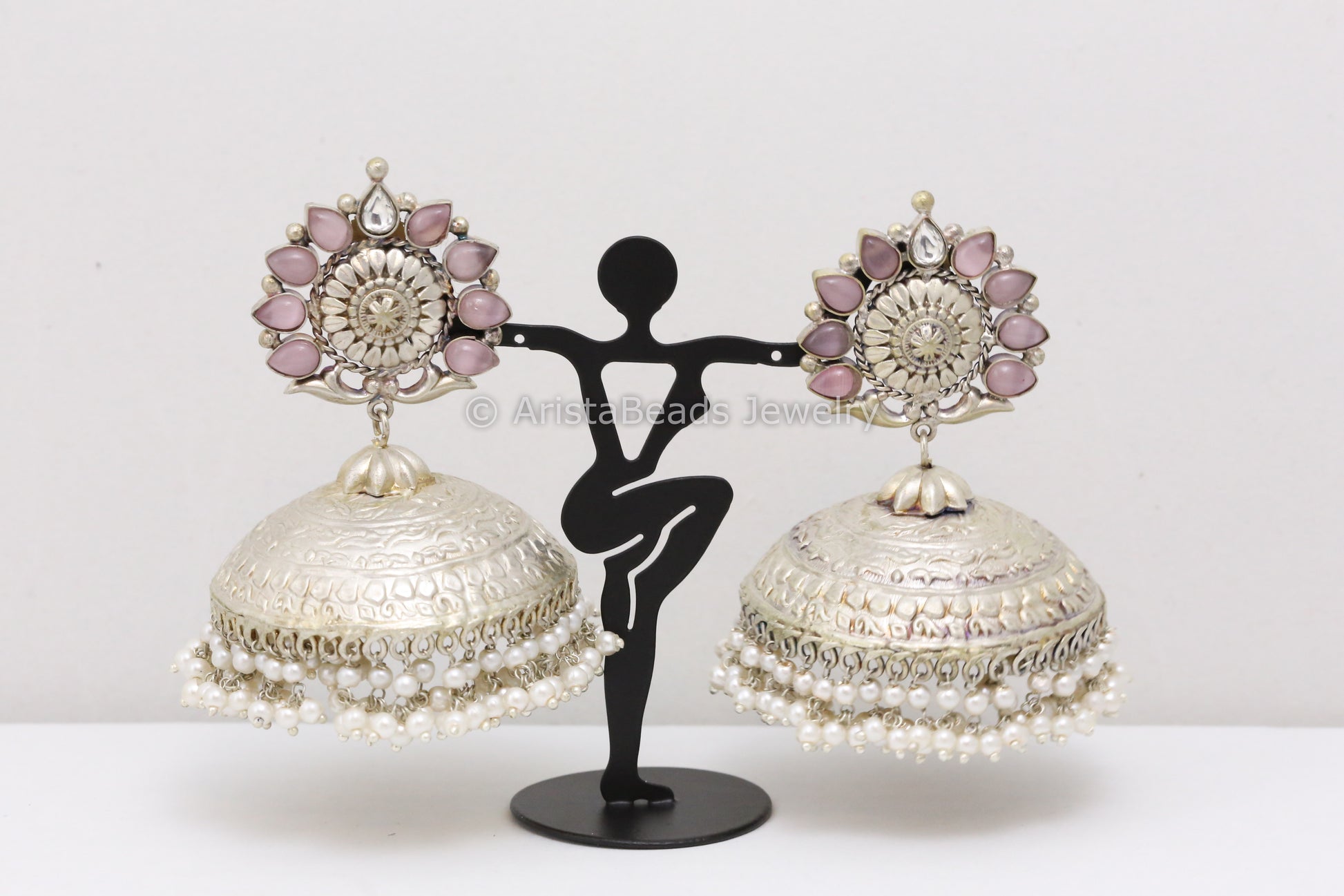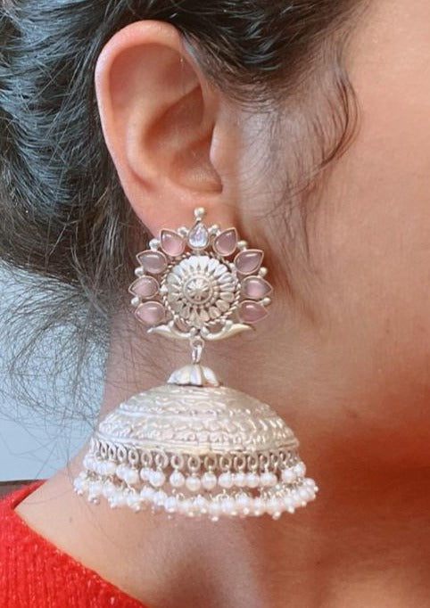Extra Large 925 Silver Polish Kundan Jhumka - Pink
