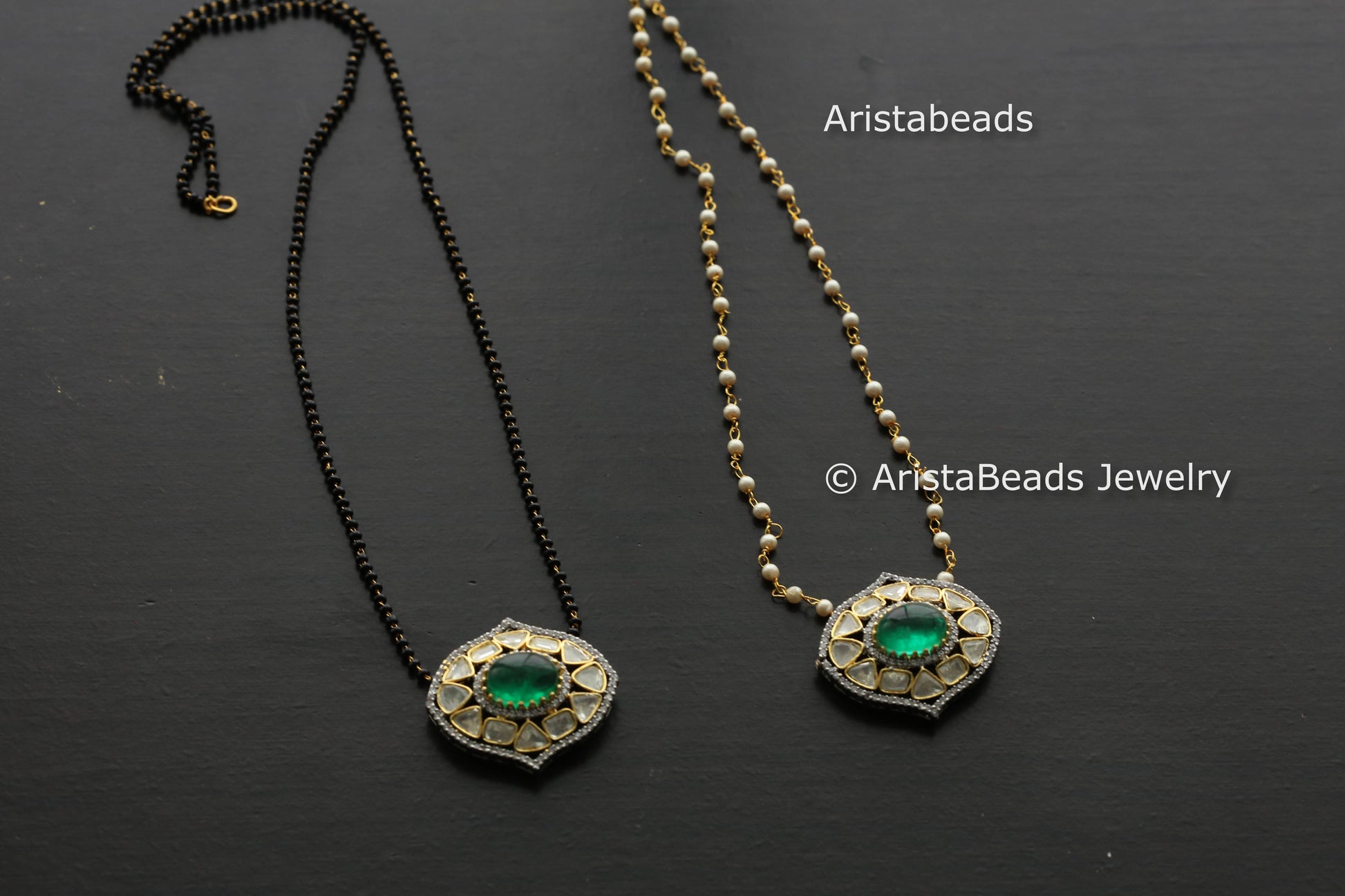 Dainty GReen Doublet Moissanite Polki Beaded Necklace