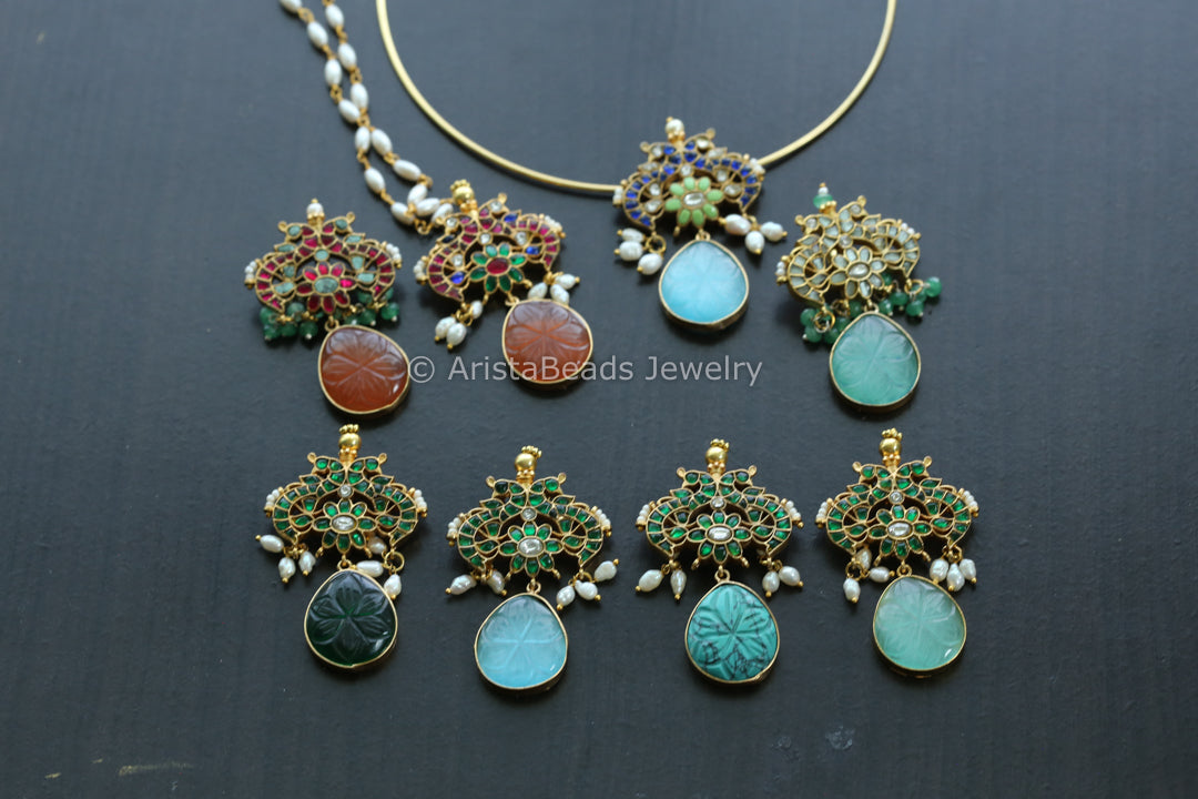 Dainty Jadau & Carved Stone Pendants - Hasli Or Pearl Chain