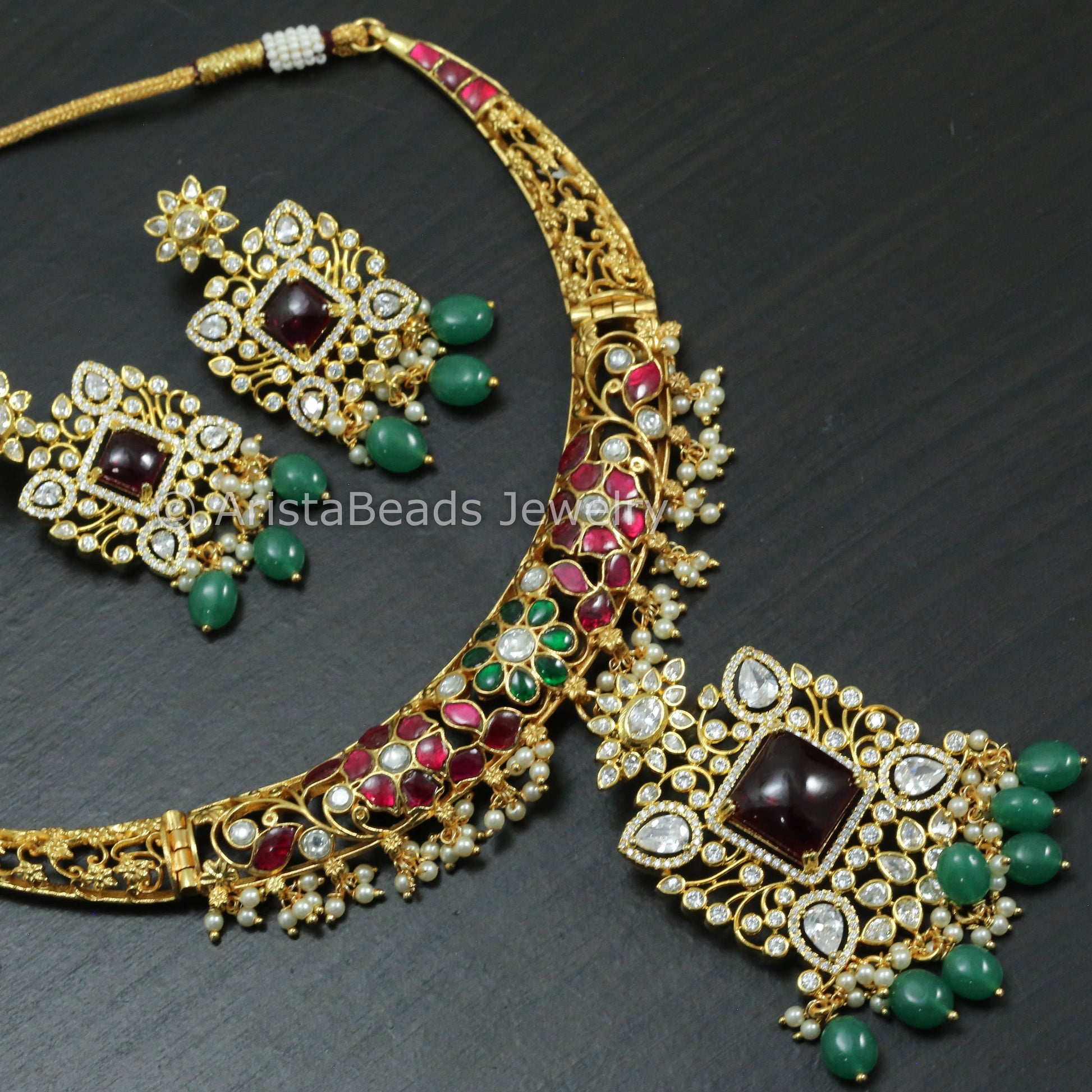 Dainty Jadau Kundan Hasli Set With CZ & Pota Stone