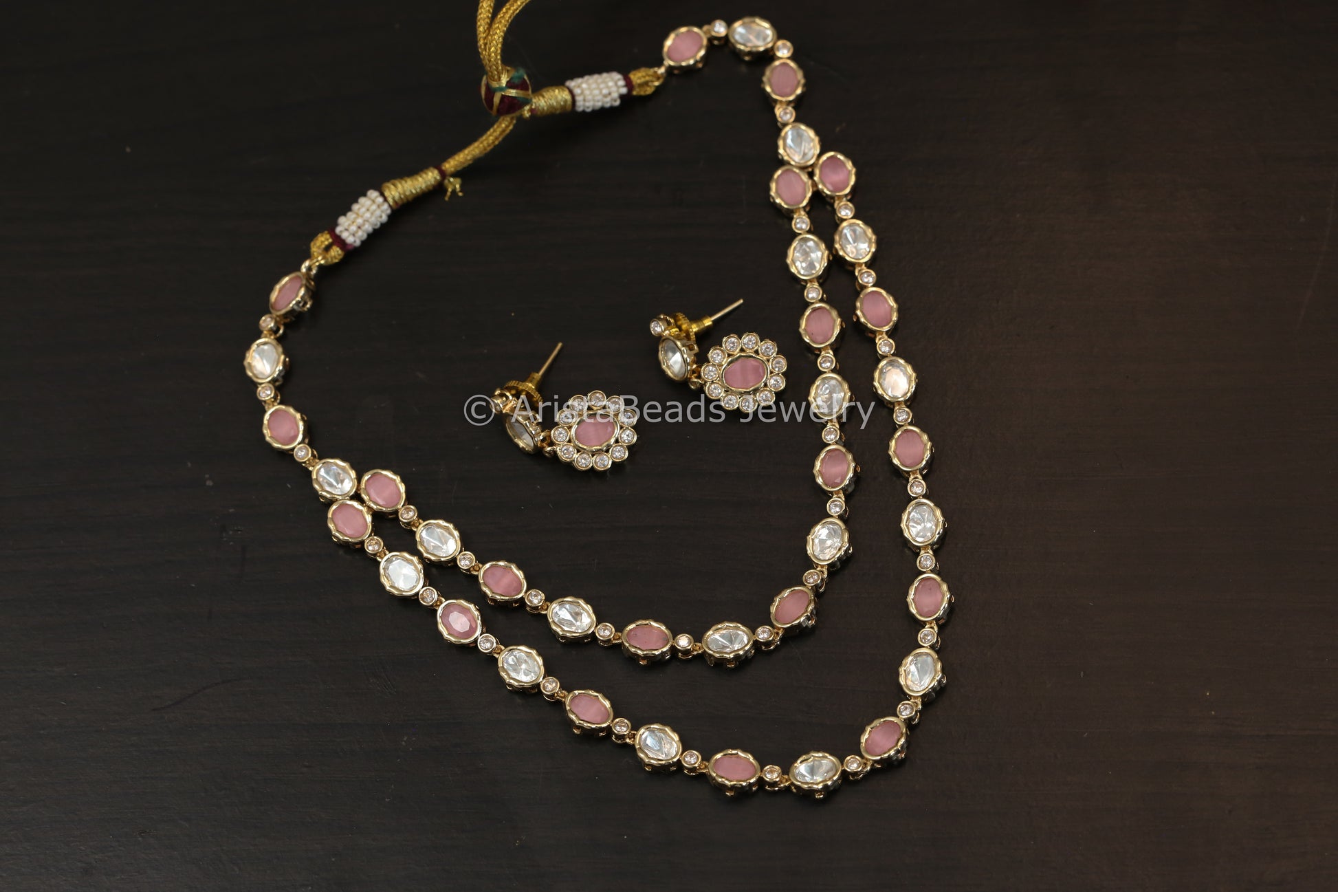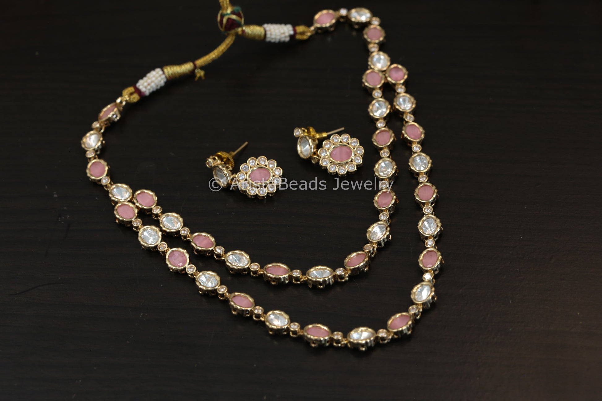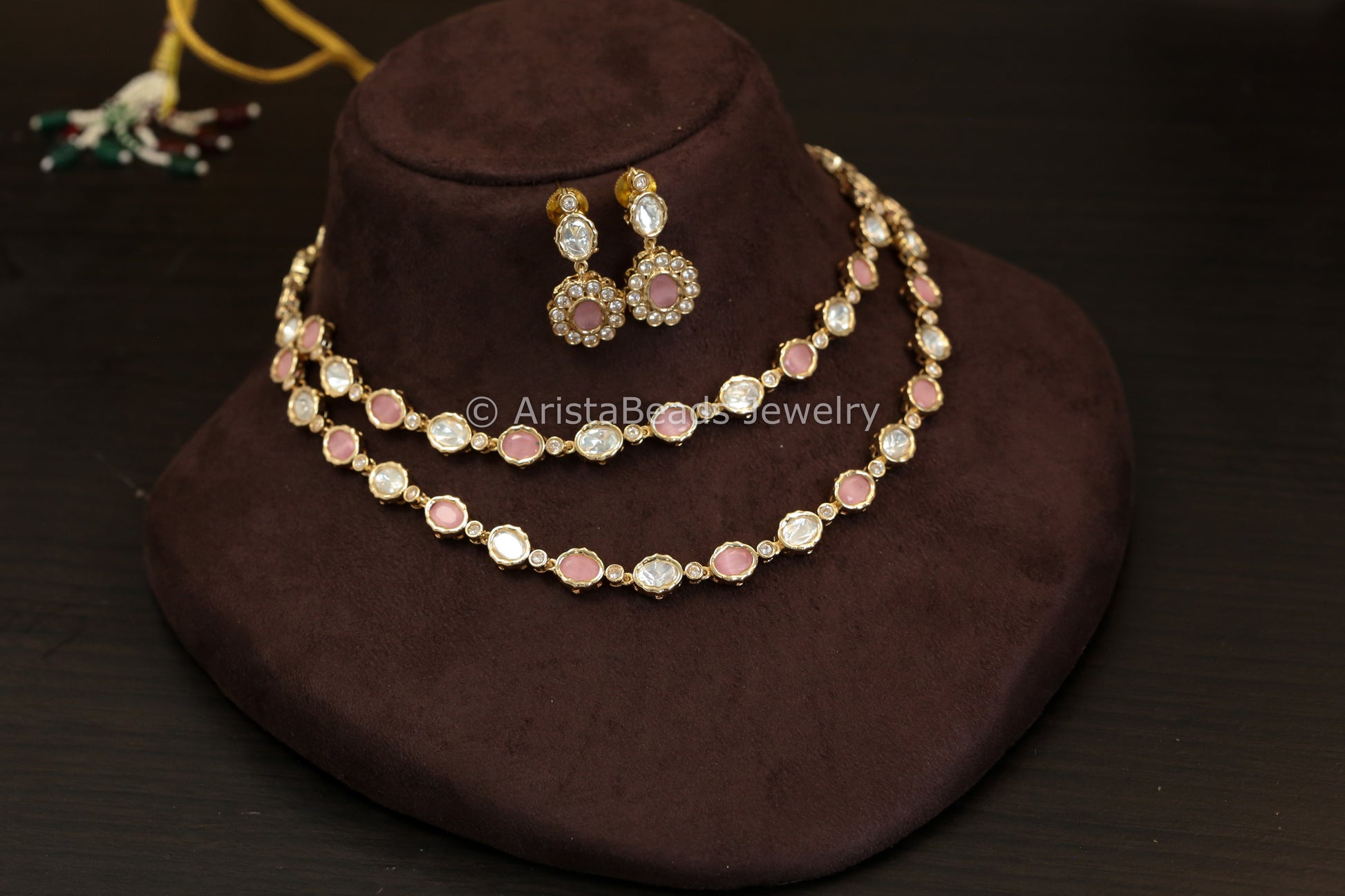Dainty Layered Uncut Polki Necklace Set - Pink