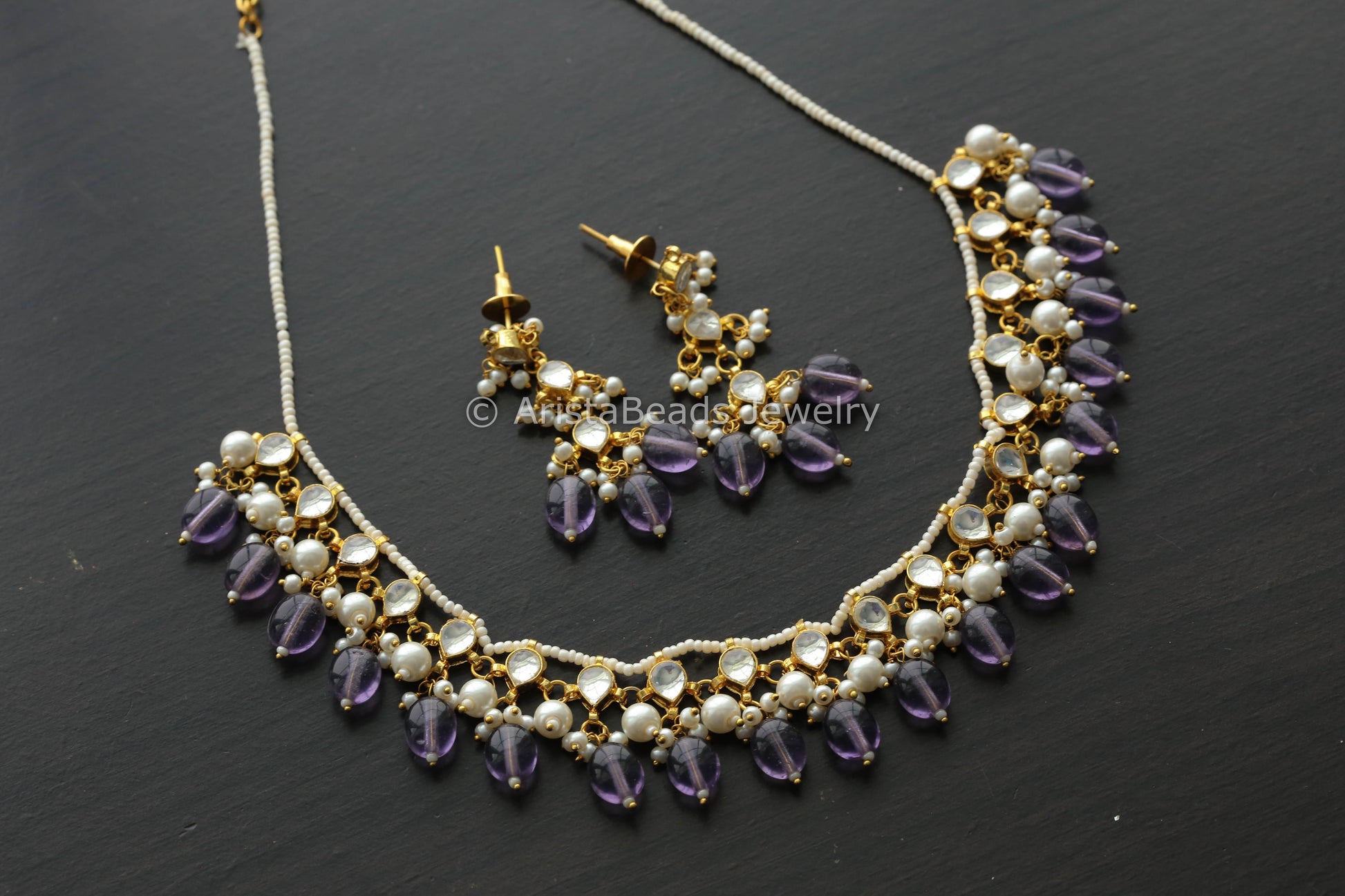 Dainty Pachi Kundan Necklace Set - Purple Drops