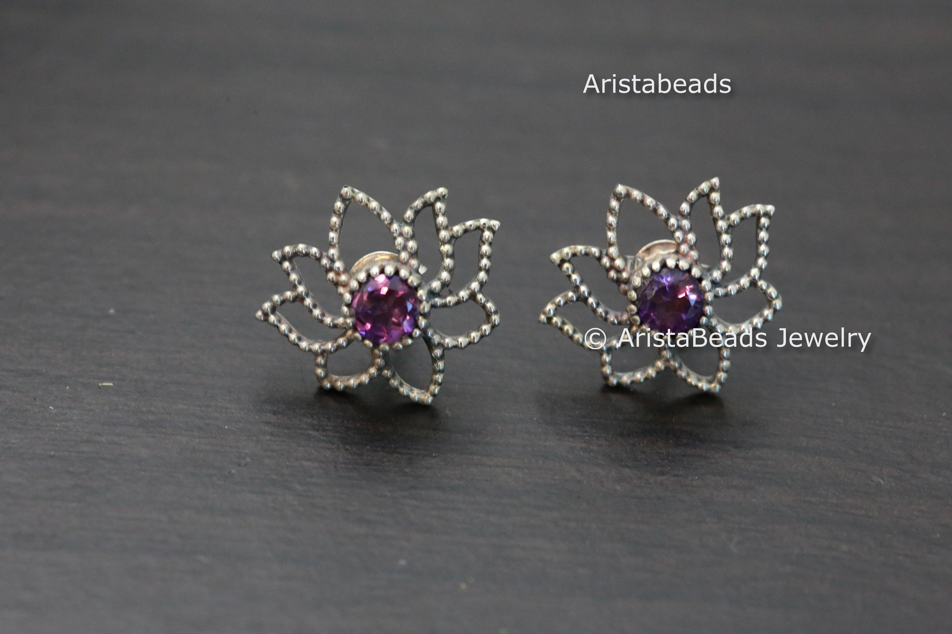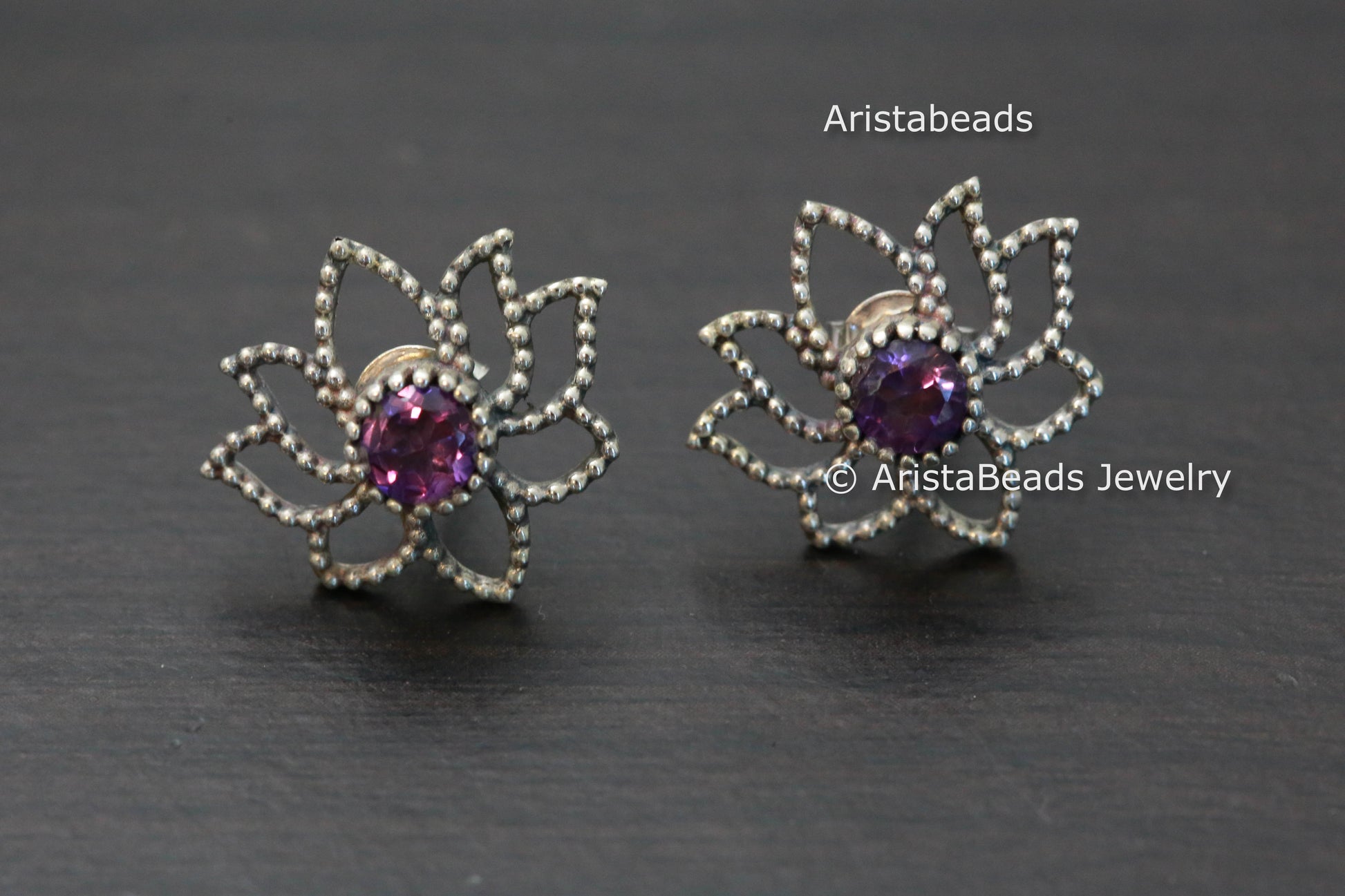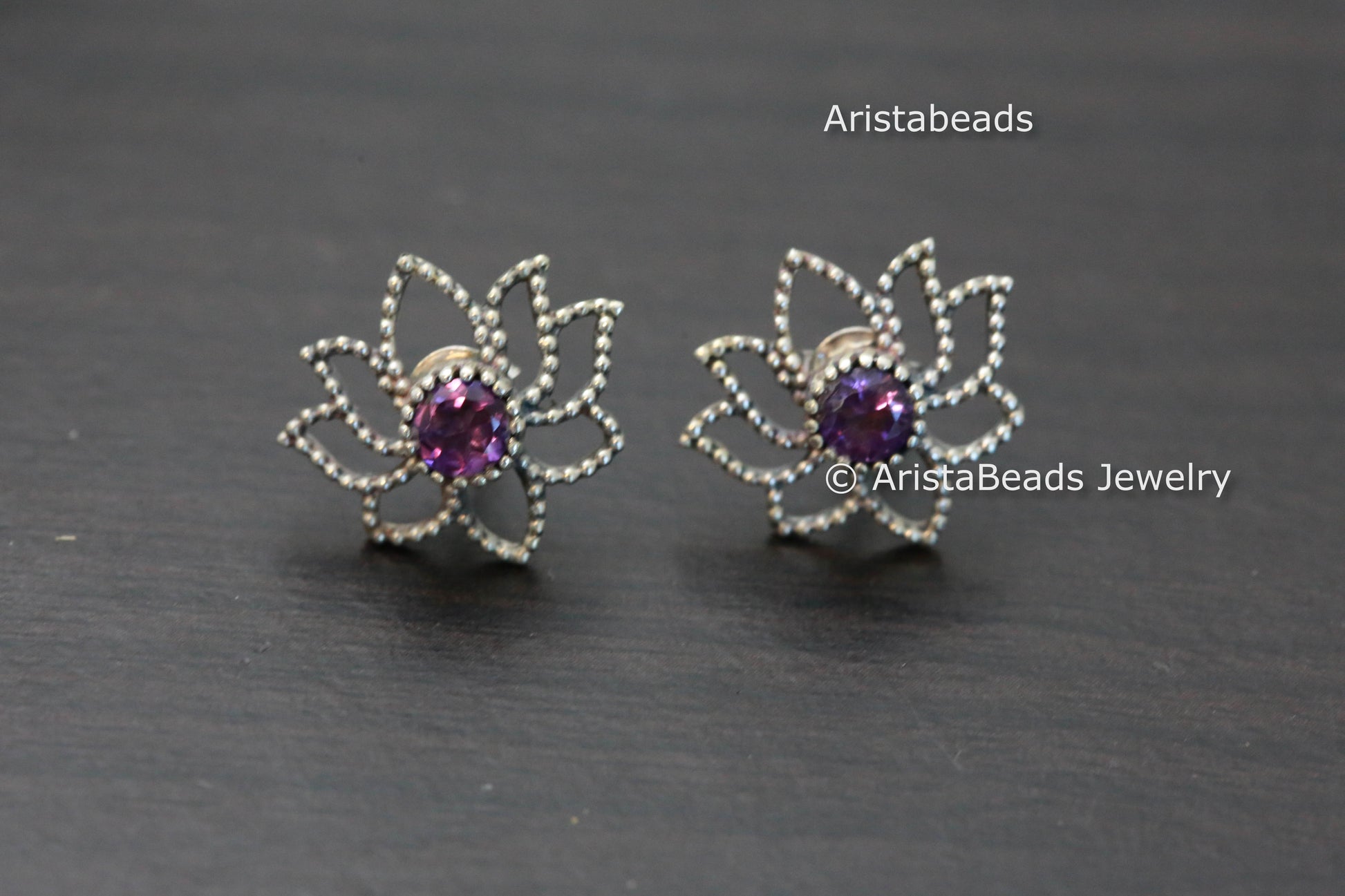 Dainty Sterling Silver Amethyst Lotus Earrings