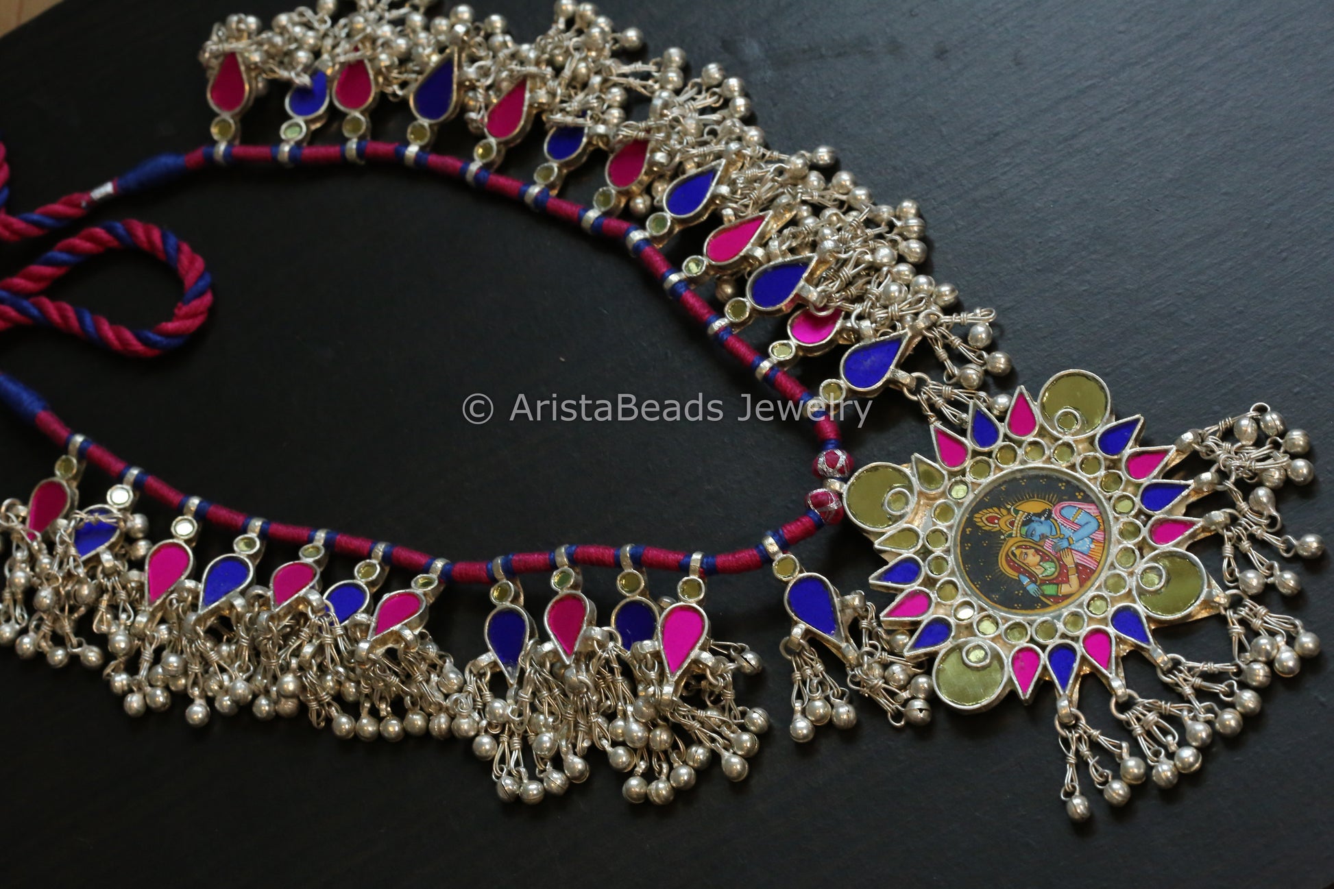 Darpan Oxidized Real Glass Long Necklace- Blue Pink