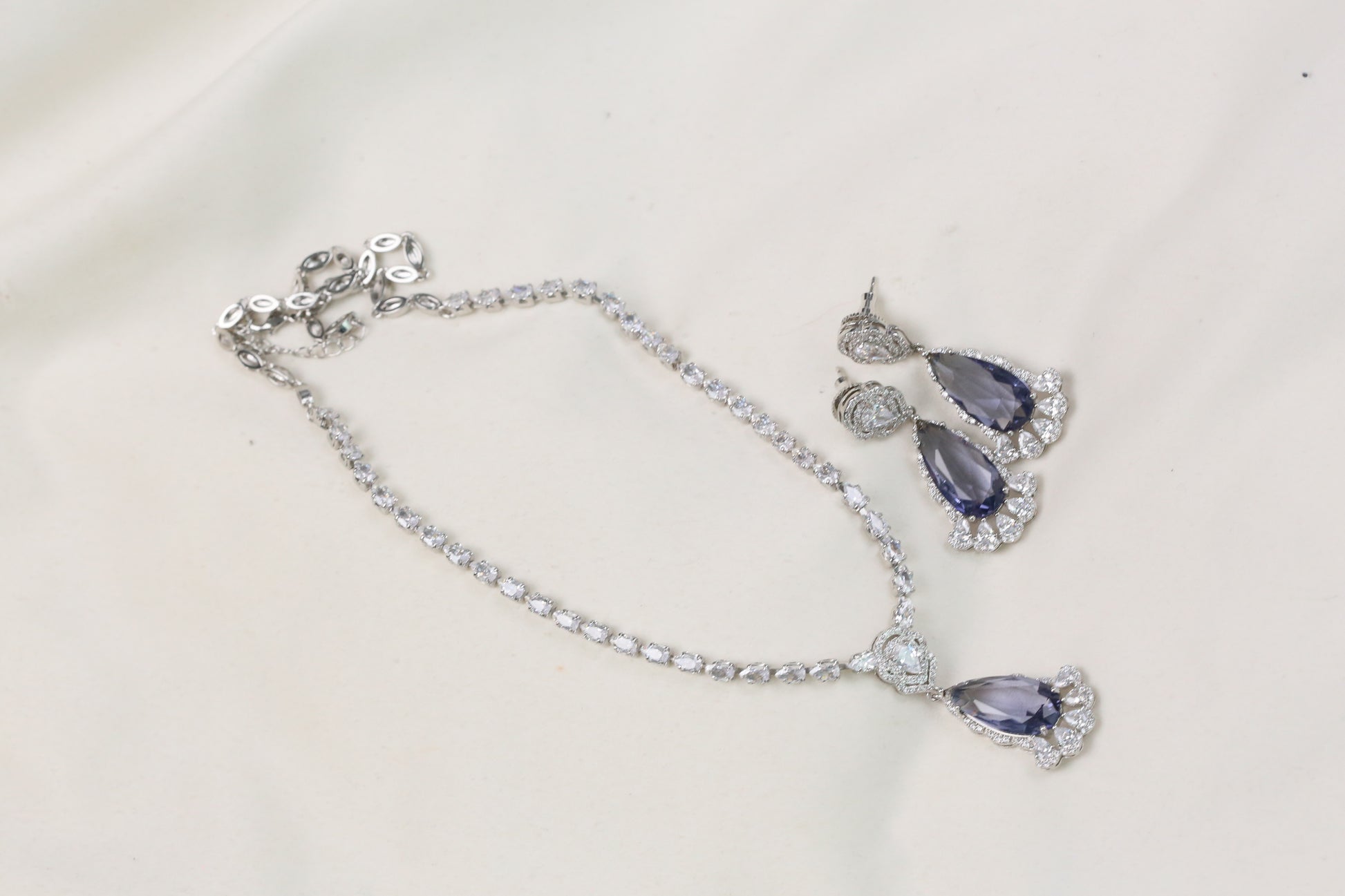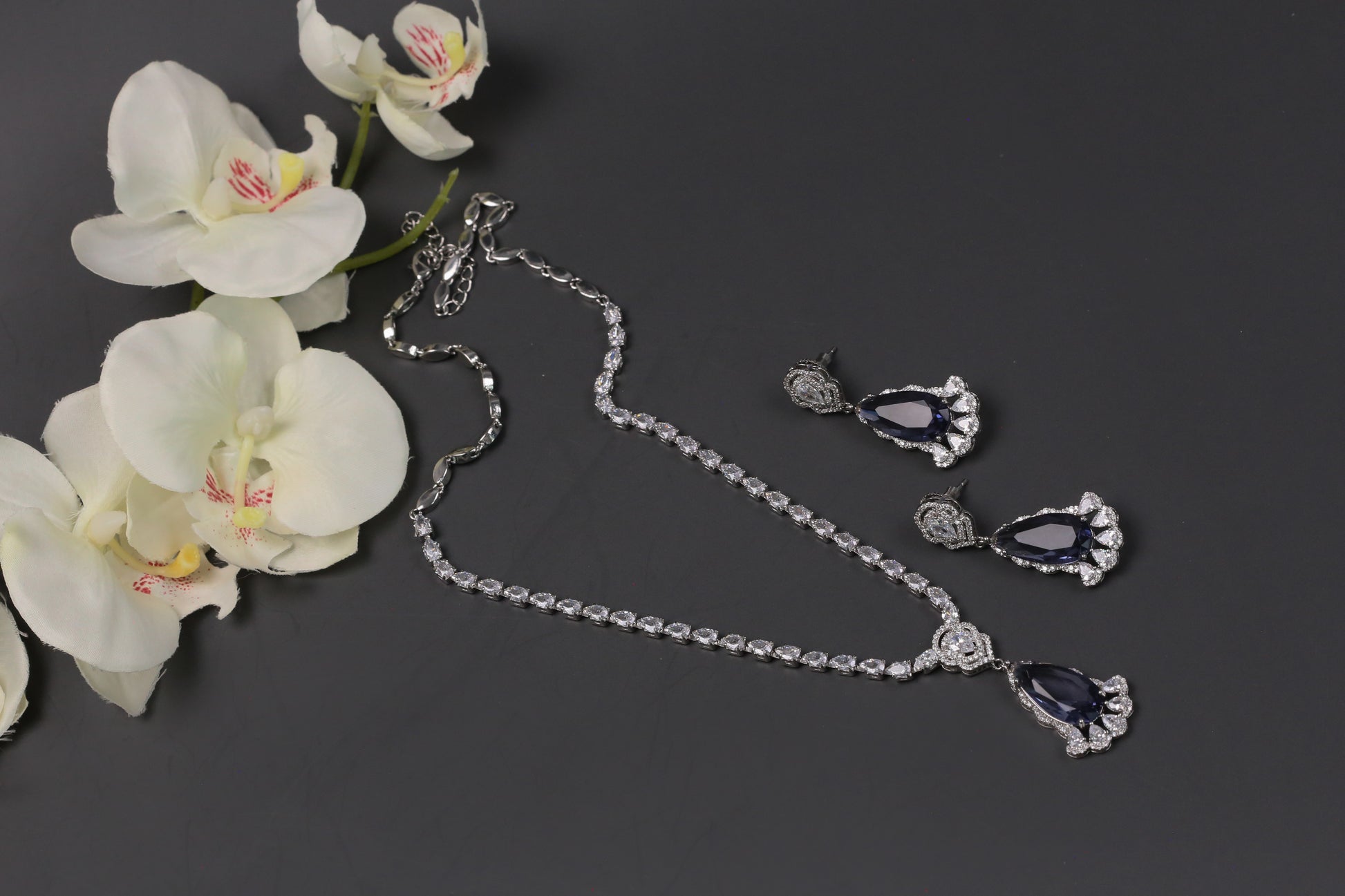 Dhara Solitaire style CZ Necklace Set - Aqua Blue
