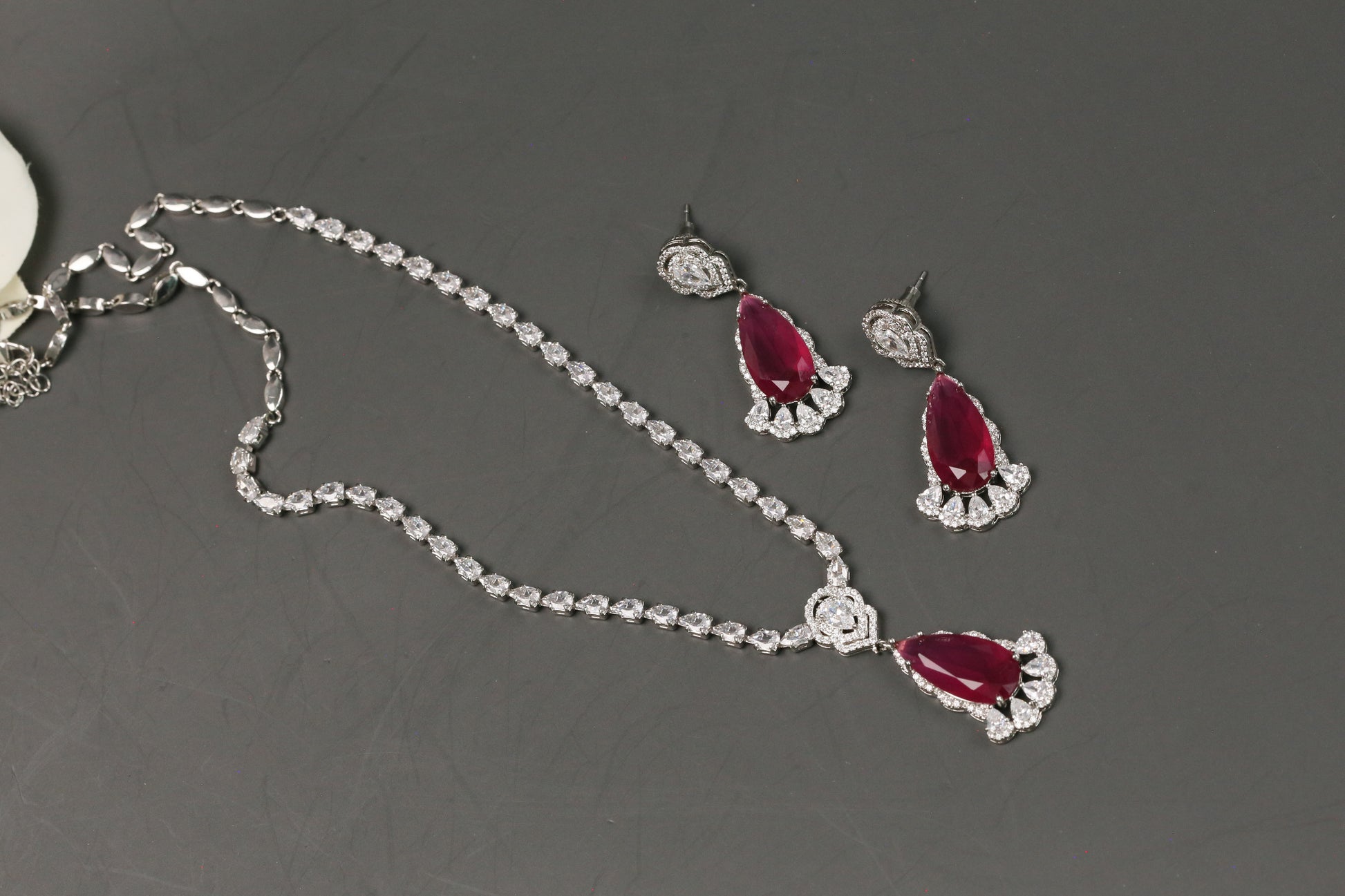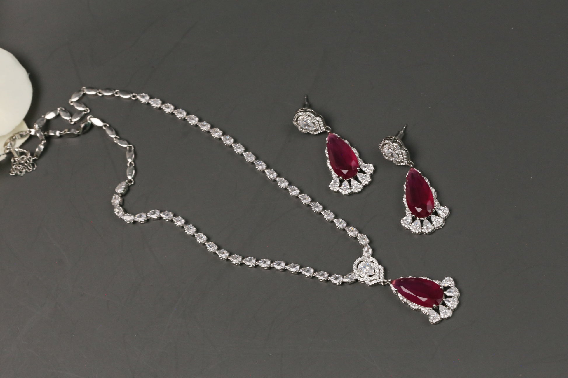 Dhara Solitaire style CZ Necklace Set - Ruby Pink