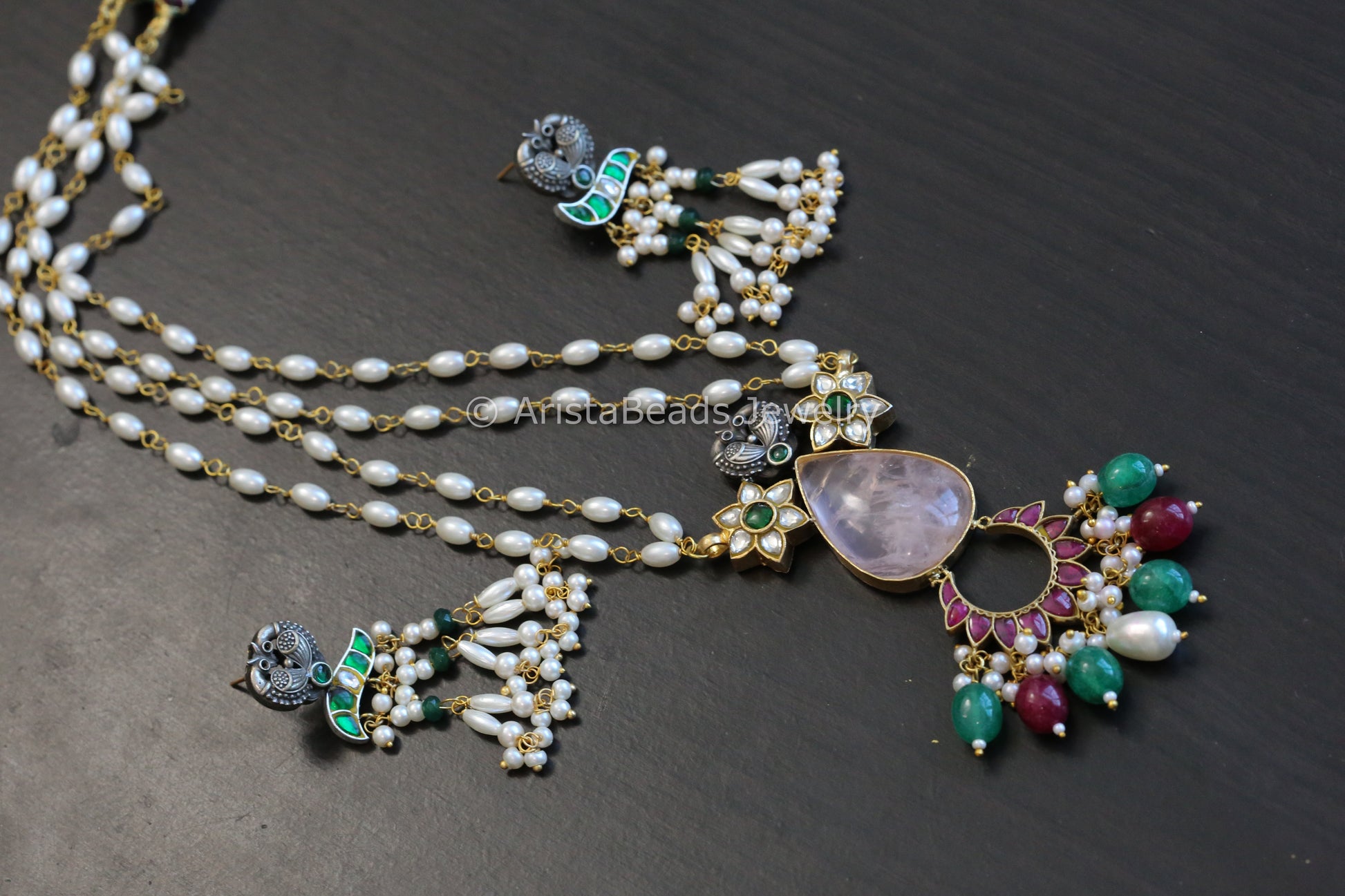 Dual Tone Jadau Kundan & Rose Quartz Necklace